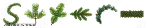 Conifer branch set including fir and pine sprigs, curved elements, and borders isolated. Christmas and winter holiday designs.