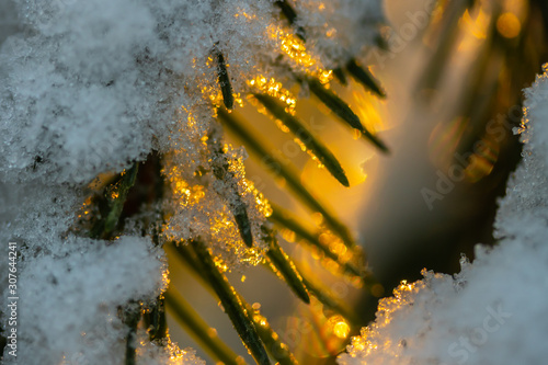 Coniferous forest at winter sunrise. Spruce branches covered with snow. Bokeh effect.
