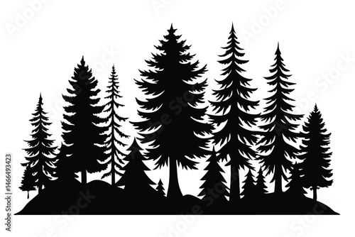 Coniferous forest featuring diverse pine trees stands boldly silhouetted against a stark white backdrop