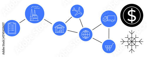 Connected icons of factory, warehouse, plane, truck, globe, shopping cart, dollar sign, and snowflake representing manufacturing logistics e-commerce global trade and economy. Ideal for supply