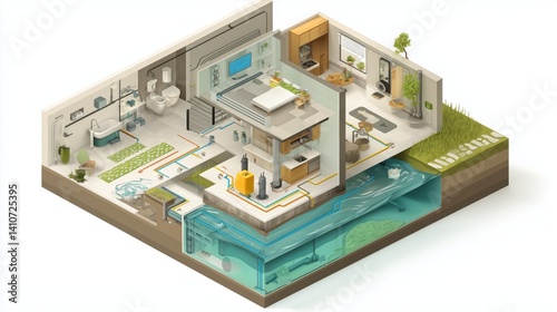 Conserve Water Week. Isometric illustration of a cross-section showing water-saving home systems throughout a modern house