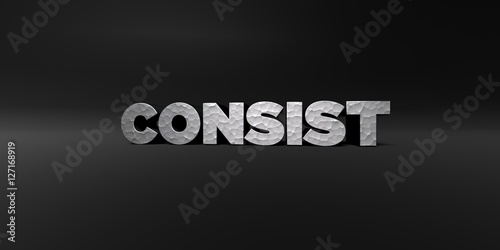 CONSIST - hammered metal finish text on black studio - 3D rendered royalty free stock photo. This image can be used for an online website banner ad or a print postcard.
