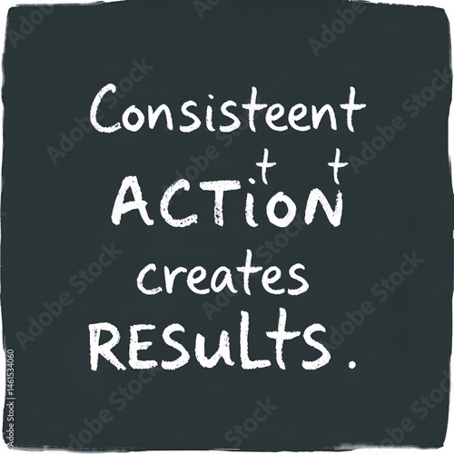 Consistent action creates results. A blackboard with white text. Illustration with grunge text style.
