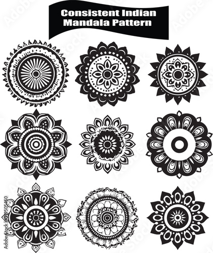 Consistent indian Mandala Pattern Silhouette Elements in Black