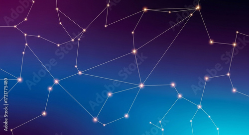 Constellation illustration with connected dots on a dark blue and purple gradient background, space and stars concept