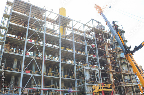 Construction and installation work with a powerful construction crane of a large new industrial oil refining petrochemical chemical plant with pipes, columns, railings, stairs and equipment
