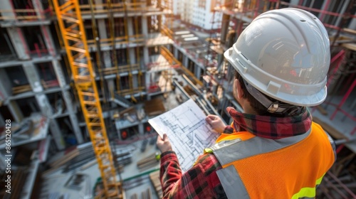 Construction chief engineer wearing hard hat and safety vest at major construction site with crane included in large building plan background check plan