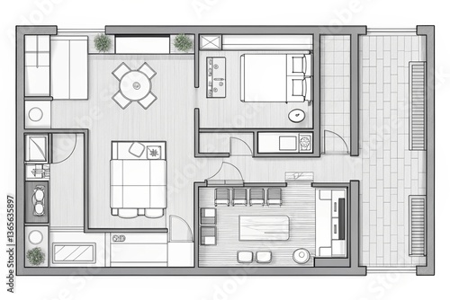 Construction concept: apartment plan, drawing, black and white photo. Photo generated by AI.