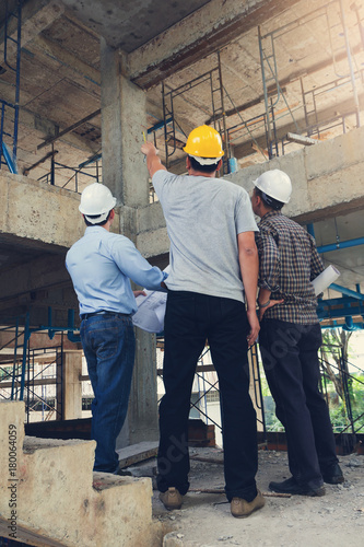 Construction concepts, Engineer and Architect working at Construction Site with blueprint, Vintage Effect