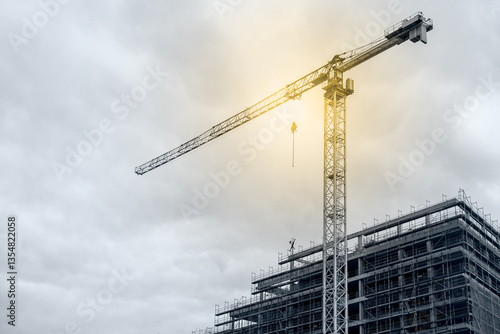 Construction crane and scaffolding of new building under cloudy sky, real estate development