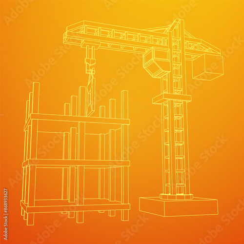 Construction crane tower. Building under construction industrial concept. Wireframe low poly mesh vector illustration.