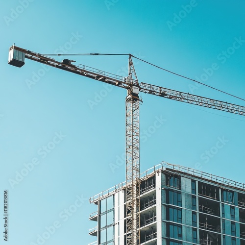 Construction crane towering over a modern building under construction against a clear blue sky.