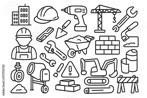 Construction doodle icon set. Vector line art collection. Industrial equipment, builder, tools, crane, excavator for engineering, architecture and renovation projects.