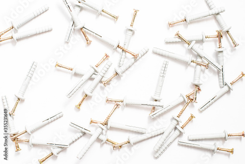 Construction dowels for concrete, stone, and walls are scattered on a white background.