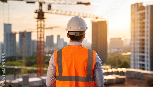 construction engineer standing with his back and watches at a house building construction. wearing a helmet and orange safety vest. working as a architect. blurry background