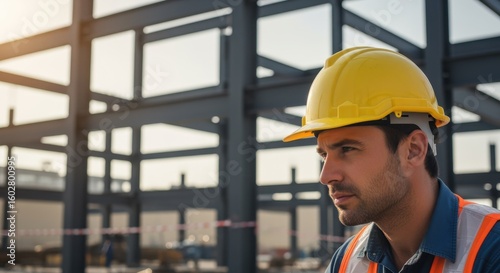 Construction engineer wearing yellow helmet supervising steel frame structure at construction site during sunset, construction industry concept
