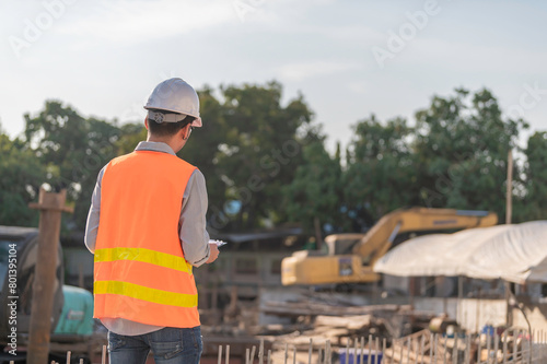 Construction engineer working on a bridge construction site over a river,Civil engineer supervising work,Foreman inspects work at a construction site