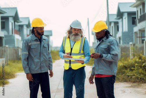 Construction engineers and their team are discussing the site preparation plan for installing solar panels, setting up the working system for an energy-saving housing project and exterior overview.