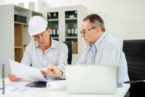Construction engineers discussing plans with blueprints and digital tablet. Safety, teamwork, planning, and architecture