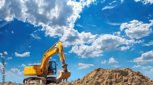 Construction excavator on a sunny day with a backdrop of blue sky and cumulus clouds