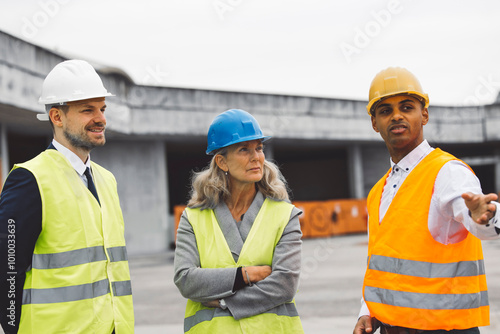 Construction industry and engineering - engineers, architects and contractors on the construction site analyzing the development of the building