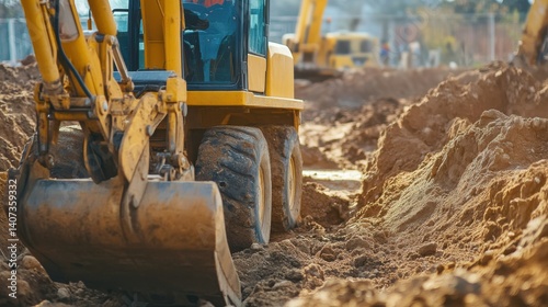 Construction laborer operating a backhoe at a construction site. Featuring expertise and focus