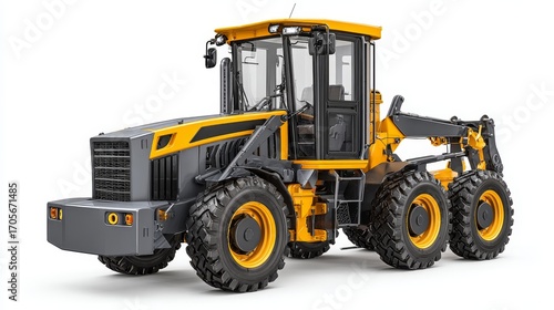 Construction machine action motor grader lift and loader working in urban environment angled view for seo impact