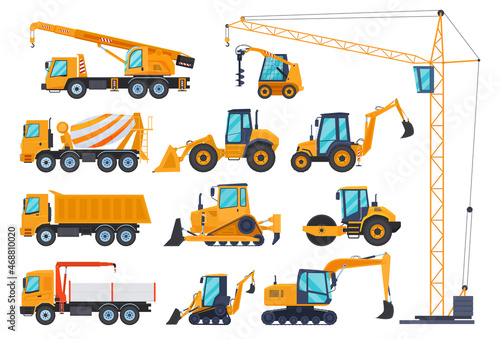 Construction machinery equipment set vector flat illustration vehicles industrial building work