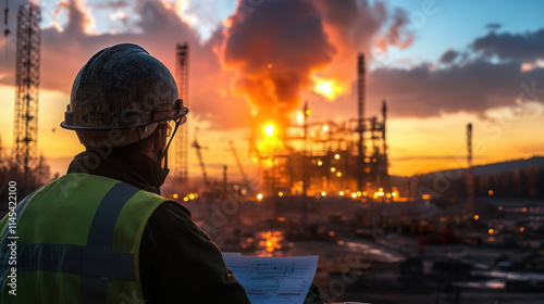 construction manager reviews safety checklists at sunset industrial site, ensuring safety amidst vibrant backdrop of smoke and flames