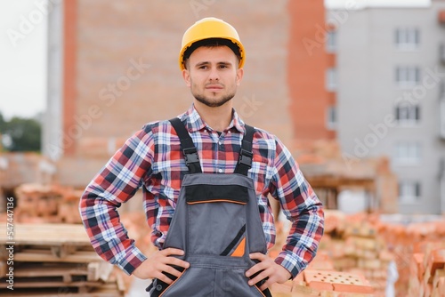 construction mason worker bricklayer installing red brick with trowel putty knife outdoors.