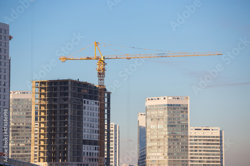 Construction of a multi-storey building. A high-rise crane on the construction of a multi-storey building.
