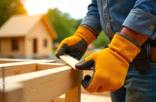 Construction of a wooden house, close-up. Hands of a professional worker, installing a wooden structure, outdoors. Illustration of construction industry