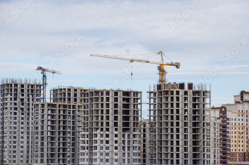 construction of multi-storey residential buildings. Tower cranes at a construction site.