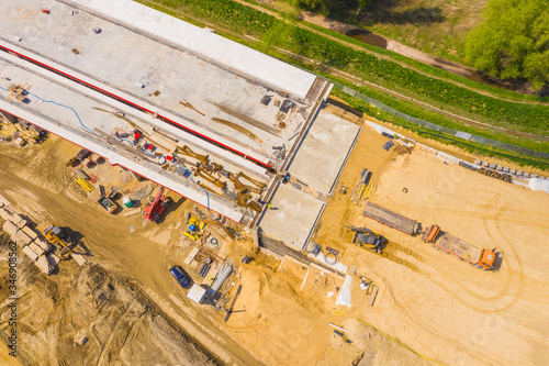 construction of new road at suburb area. aerial top view on industrial equipment and machinery working at city construction site