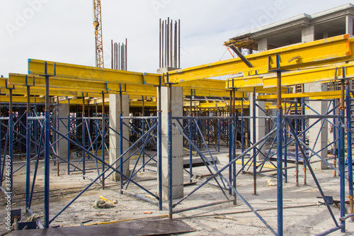 Construction of reinforced concrete. Concrete formwork and floor beams on construction site