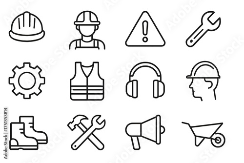 Construction safety and tools icons: helmet, work gear, tools, and warning symbols