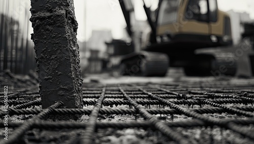 Construction site, concrete footing, reinforcement mesh, excavator in background