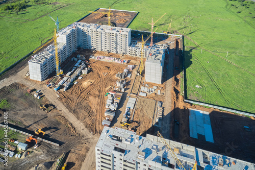 Construction site. Construction of a panel multi-storey building. Shooting from a drone.