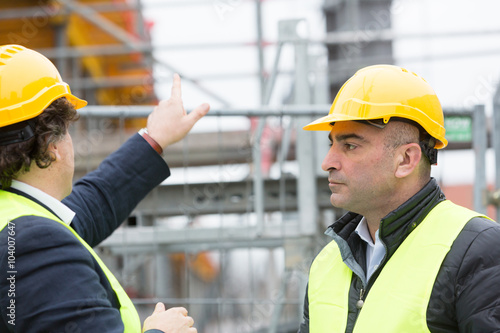 Construction site managers with yellow safety jacket and helmet at work. Outdoors