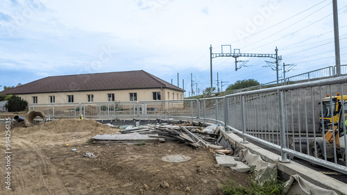 Construction site near railway tracks with scattered materials and fenced off area, showing urban development progress issues