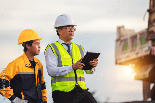 Construction Site Overview with Professional Workers in Safety Gear and Helmet Using Digital Tablet for Project Management and Collaboration