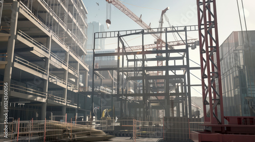 construction site showcasing steel framework and cranes, highlighting industrial environment and ongoing development. scene captures essence of modern architecture and engineering