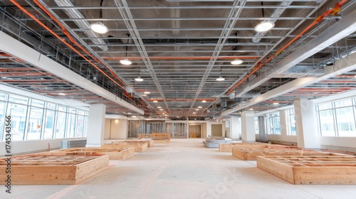 Construction site showcasing wooden structures and exposed utilities in a newly built interior space