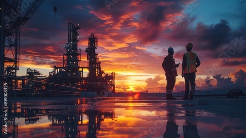 Construction site with architect, civil engineer, and worker evaluating project plans. Silhouetted figures against the sunset sky