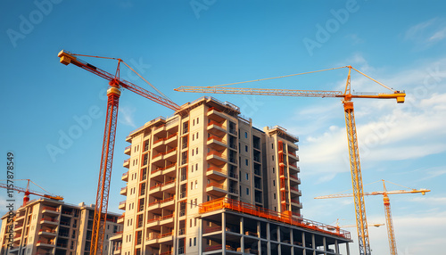Construction site with cranes against the blue sky. tower cranes constructing a new residential building at a construction site, craft clay. isolated with white highlights