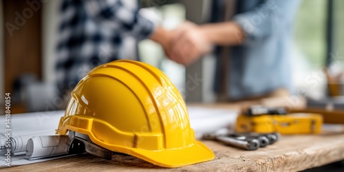Construction site with safety helmet and blueprints (1)