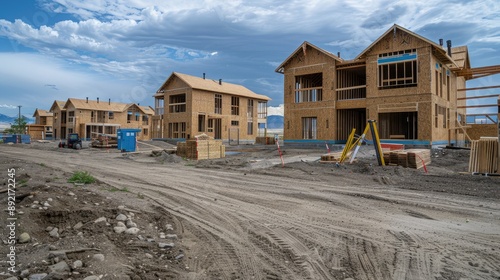 Construction site with wooden houses in progress under a cloudy sky.