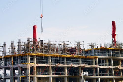 Construction site with workers assembling concrete monolith high-rise structure, scaffolding, industrial equipment, and architectural framework in progress.