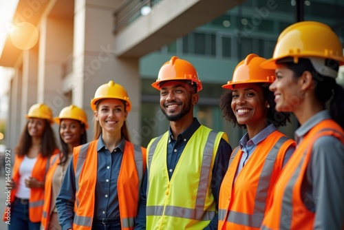 Construction site workers. Diverse construction workers wearing orange helmets and safety vests smiling standing in line at modern building site industrial background teamwork concept