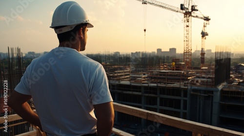 Construction supervisor overseeing project development at urban site during sunset photography industrial environment wide-angle perspective